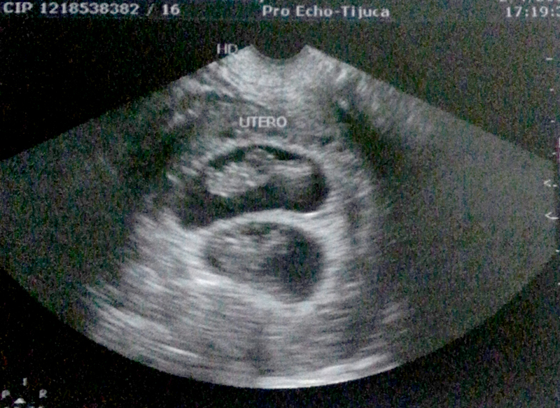 Ultrassom de 4 semanas. Na primeira ecografia gestacional a partir da 6º semana de gestação já é possível saber se a gravidez é de gêmeos. Veio o medo de a gravidez não estar evoluindo novamente mas junto com esse medo veio a surpresanão era um mas sim dois bebês.