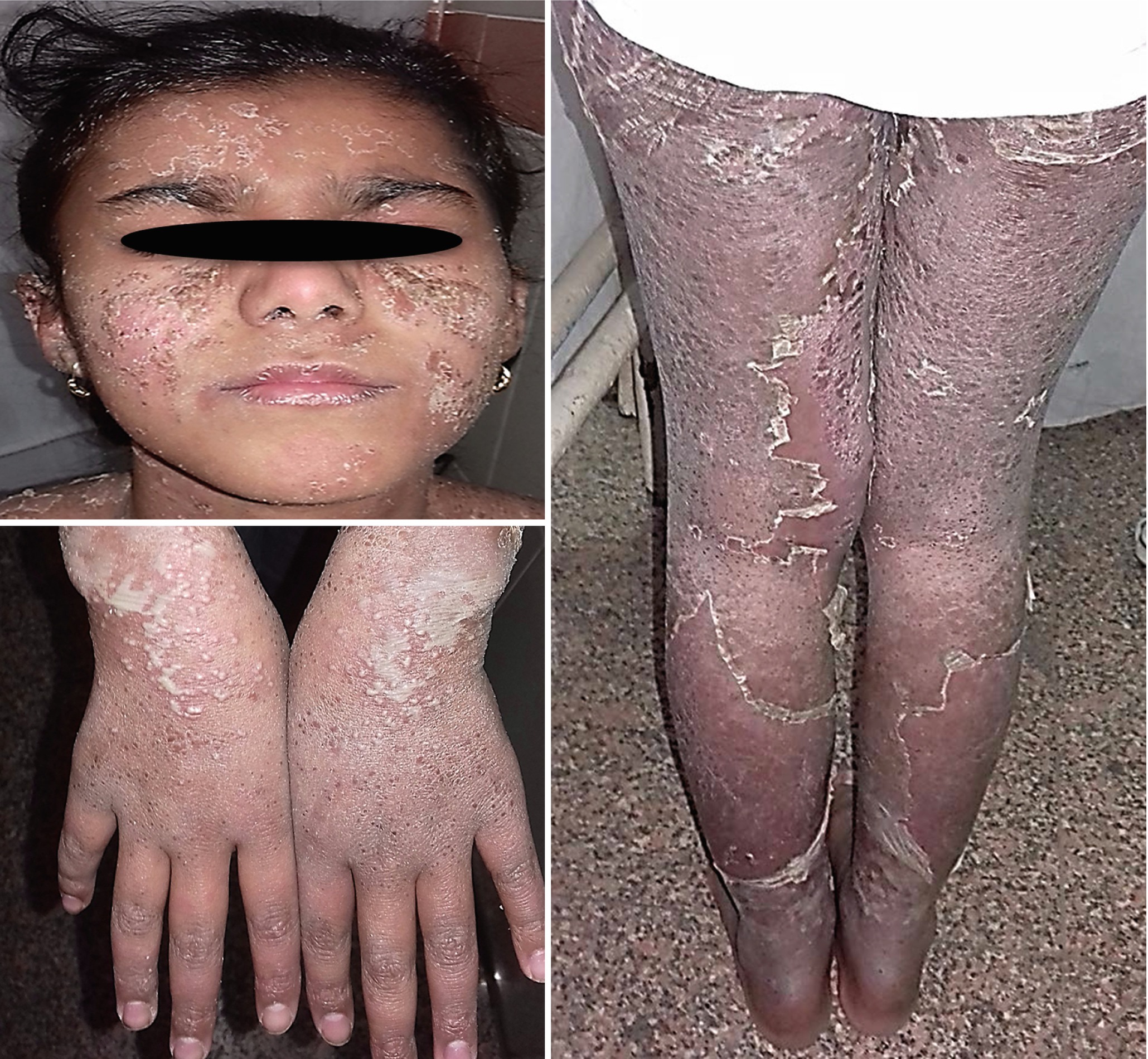 Refer to the related chapter on Peeling skin conditions. 1 2 3 4 5 Occasionally there is accompanying erythema and vesicular lesions. Acral refers to the fact that the peeling is most apparent on the hands and feet although peeling may also occur on the arms and legs1125811259 The peeling is usually present from birth but can appear later in childhood or early adulthood1125811260.