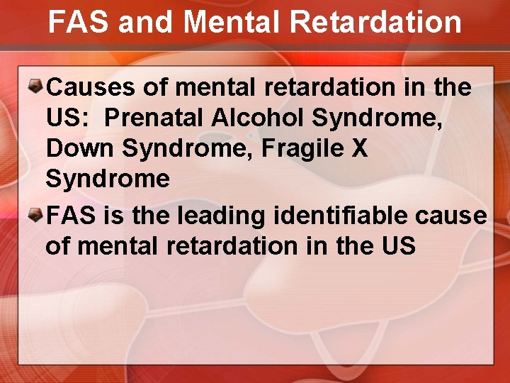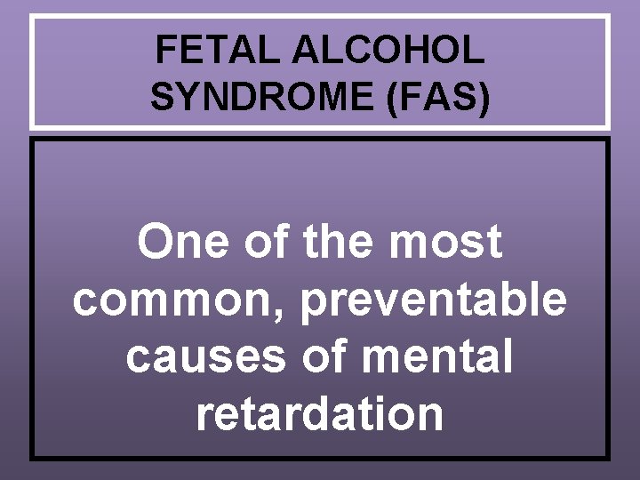 Prevalence of FAS is estimated to be between 05 and 2 per 1000 births. 28 Mental retardation is the abnormality most often associated with the diagnosis of FAS. These fall under the term Fetal Alcohol Spectrum Disorders FASD the most known of which is Fetal Alcohol Syndrome FAS and Fetal Alcohol Effects FAE.
