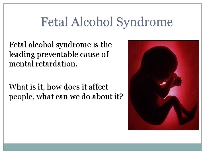 The effects of the Fetal Alcohol Syndrome include mental retardation malformations of the skeletal system and other major organ systems especially the heart and the brain inhabited growth central nervous system complications poor motor skills mortality difficulty with learning difficulty in remembering things developing as an introvert difficulties with social interactions a less attention. They continue to exhibit decreased growth postnatally. One of the most common issues that is seen is a small baby and one that has strange facial abnormalities. Estimates of birth prevalence vary among countries. Fetal alcohol syndrome is now leading cause of mental retardation. The full expression of fetal alcohol syndrome includes reduced growth facial anomalies and mental retardation. Fetal alcohol syndrome-Alaska Arizona Colorado and New York 1995. Mental retardation appears to be related to the degree of dysmorphic severity of appearance. The critical period for alcohol exposure appears to be in the initial 3 to 6 weeks of brain development.