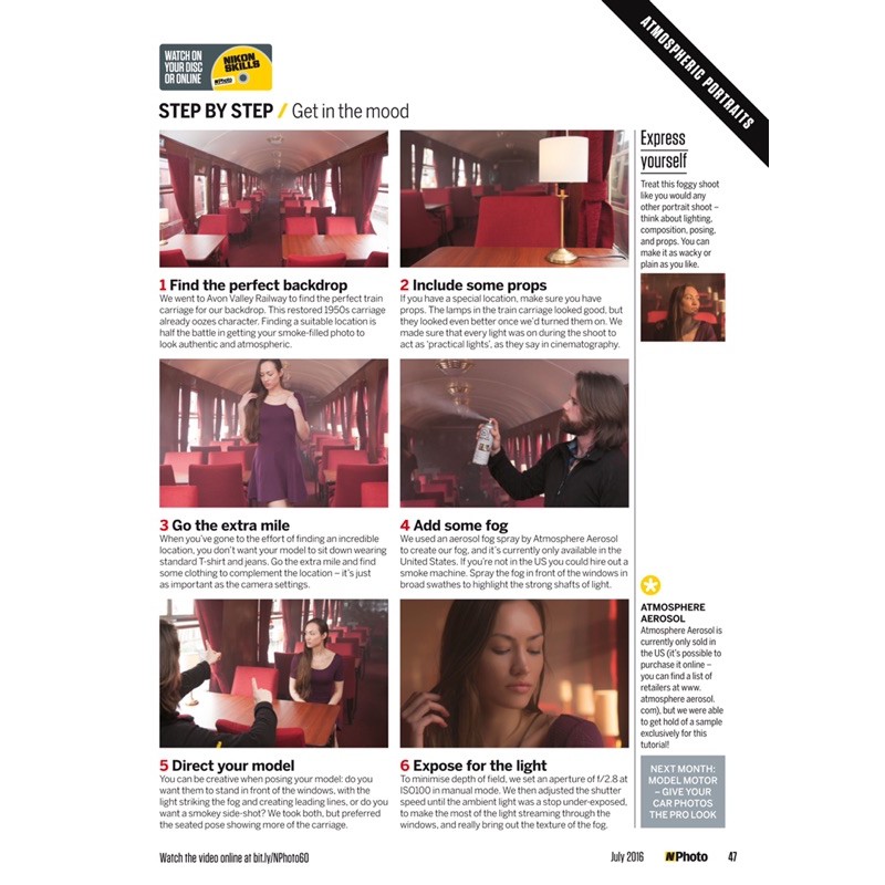 Can easily fits in your camera bag. Atmosphere Aerosol looks like hairspray but without the choking fumes. Unlike an expensive fog machine that requires electricity Atmosphere Aerosol comes in a lightweight can that is smaller than a 70-200 lens so it easily fits into most camera bags.