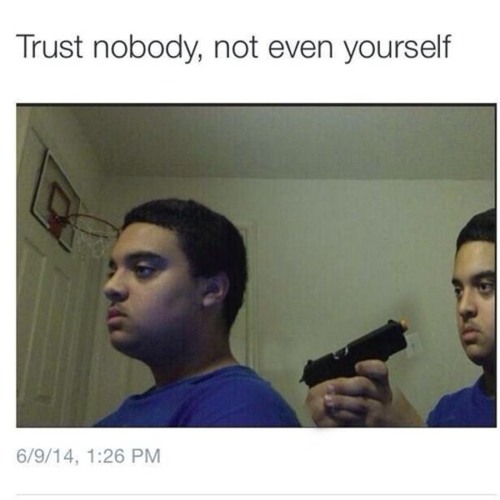 Trust Nobody Not Even Yourself Best Funny Pictures Funny Pictures Dear God. Dont trust yourself you cant trust anyone not even yourself trust no one guy shoots self guy pointing gun at himself. Make Dont trust yourself memes or upload your own images to make custom memes.
