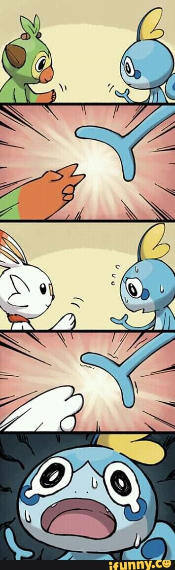 Sobble pokemon meme. Fans were immediately obsessed with the new starter Pokémon Sobble Scorbunny Grookey and region Galar. Pokemon sword and shield memes have fans picking their sides between scorbunny sobble and poor lonely grookey in the new generation of monsters. In the autumn of 2018 the image was used as a reaction image paired with captions where a set-up leads to a predictable outcome that nevertheless leaves one surprised.