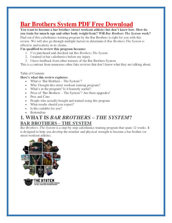 Get your digital edition of Bar Brothers The System PDF eBook Is The 12 Week Program Free Download subscriptions and publications online from Joomag. The program works by using calisthenics and body-weight exercises which are massively beneficial for building strength and gaining muscle mass fast. Get your digital edition of Bar Brothers The System PDF Review.