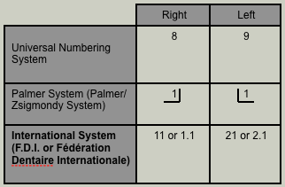 The Universal Numbering System used in US FDI World Dental Federation notation and the Palmer Notation Method. Histories of all tooth-numbering methods were traced and the strengths and deficiencies of each system were reviewed. There are several teeth numbering systems. ZSIGMONDY AND PALMAR NOTATION In 1947 a committee at the American Dental AssociationADA recommended the symbolicZsigmondyPalmar system as the numbering method of choice. Universal numbering system USA the American system. Zsigmondy- palmer system The Hungarian dentist Adolf Zsigmondy discovered this system in 1861 using a Zsigmondy cross to record quadrants of tooth positions. Palmer notation method 2.