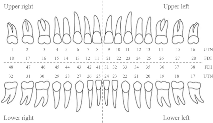 Palmer Notation Method This tooth numbering system which is very popular in the UK is simplicity itself the mouth is divided into 4 quadrants upper left upper right lower left lower right and teeth are numbered 1-8 going from the front tooth to the wisdom tooth in each quadrant. The Universal Numbering System used in US FDI World Dental Federation notation and the Palmer Notation Method. Adult teeth were numbered 1 to 8 and the child primary dentition also called deciduous milk or baby.