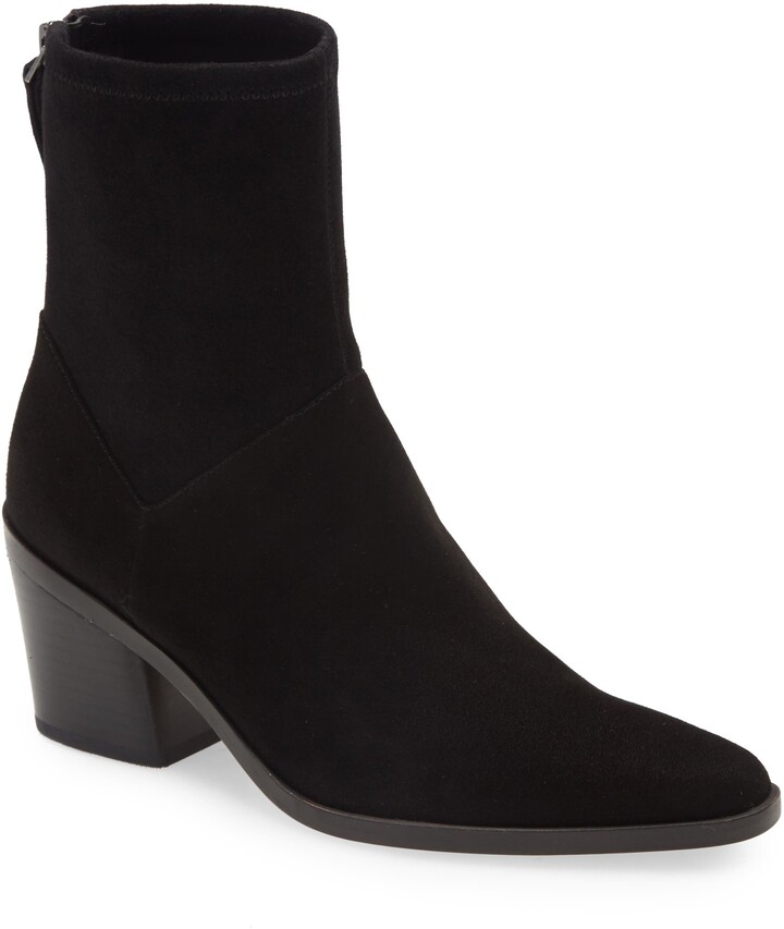 A socklike design intensifies the contemporary appeal of a block-heel bootie in a sleek streamlined silhouetteRuns small.